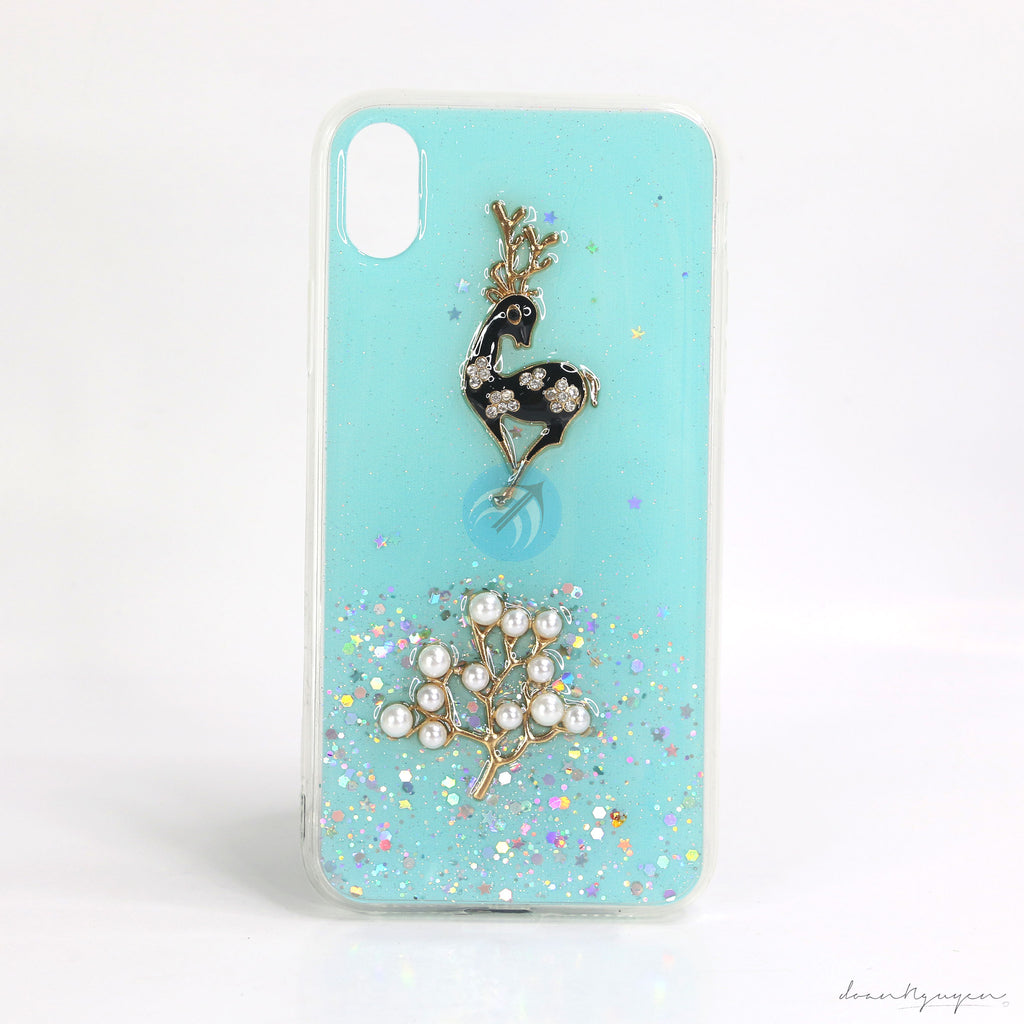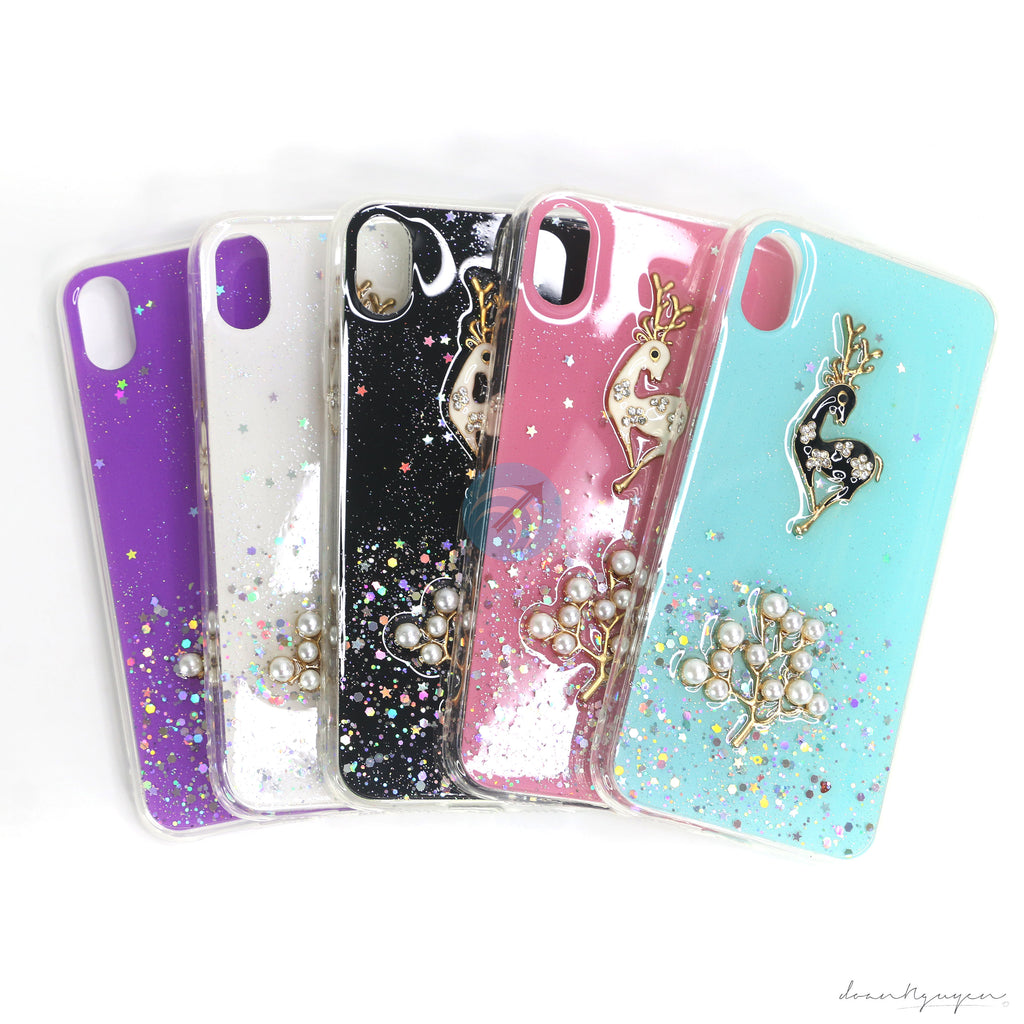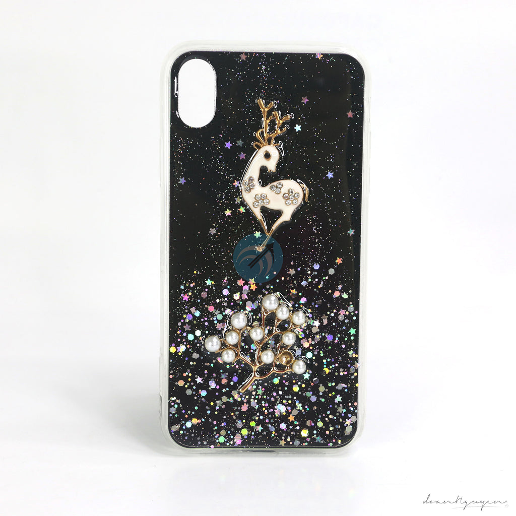 Lưng ốp có hình hươu nổi tinh tế, đính ngọc trai và đá, bên trong có kim tuyến để tăng thêm độ lấp lánh
