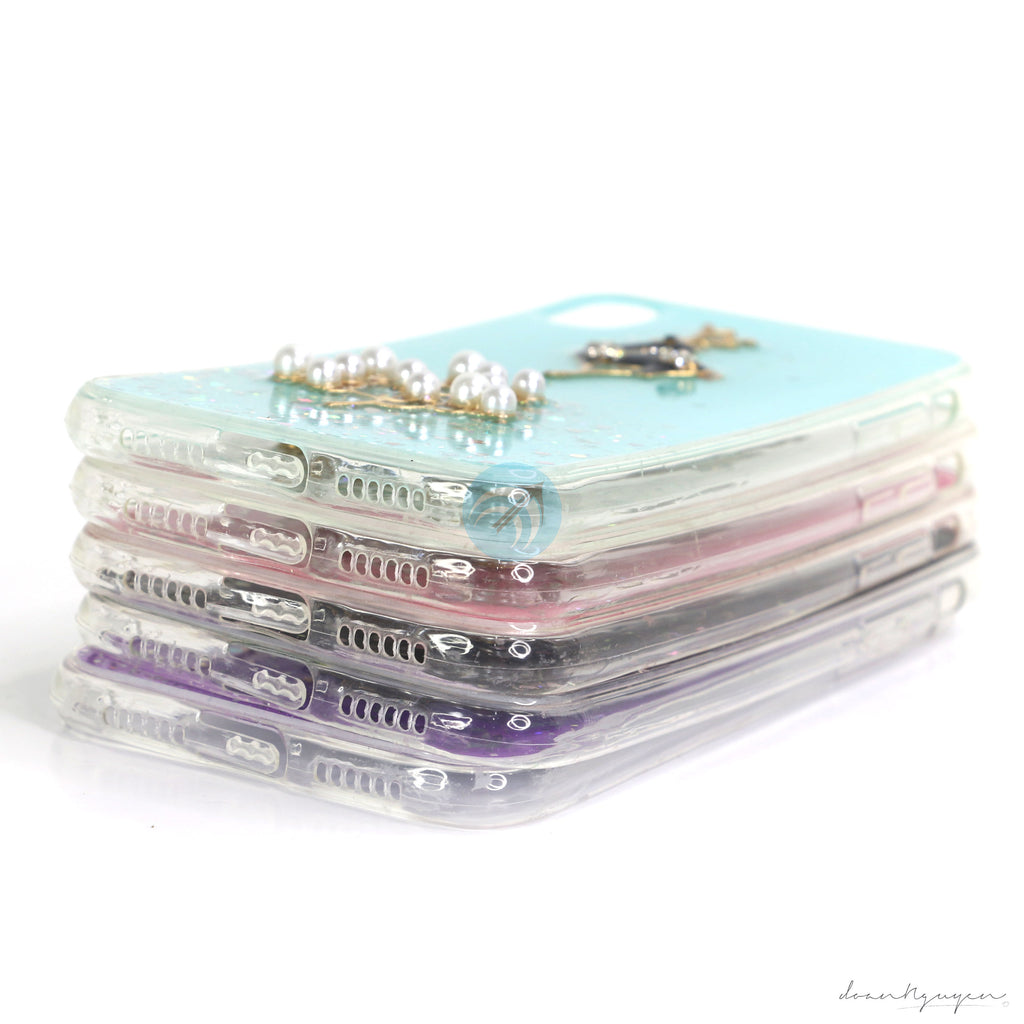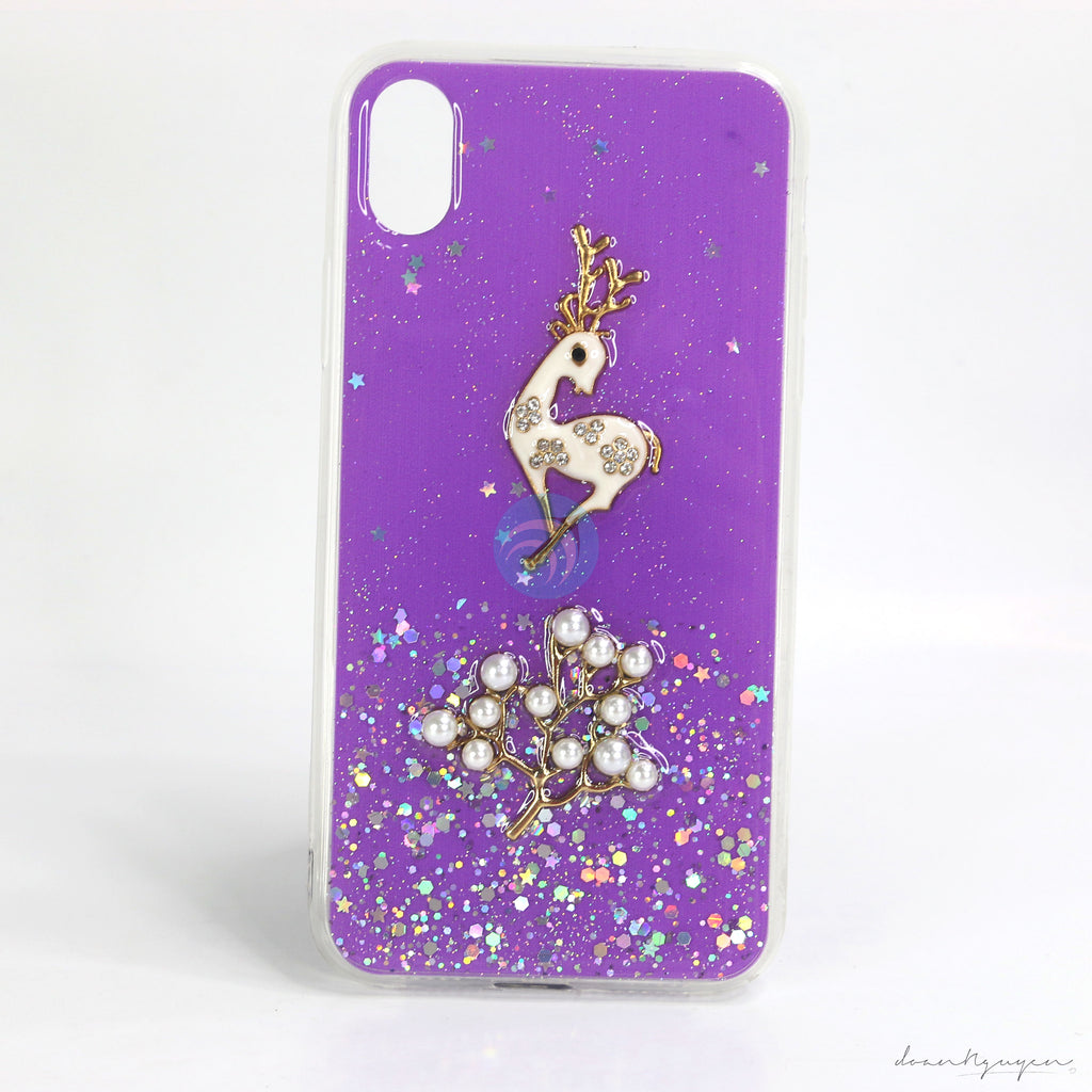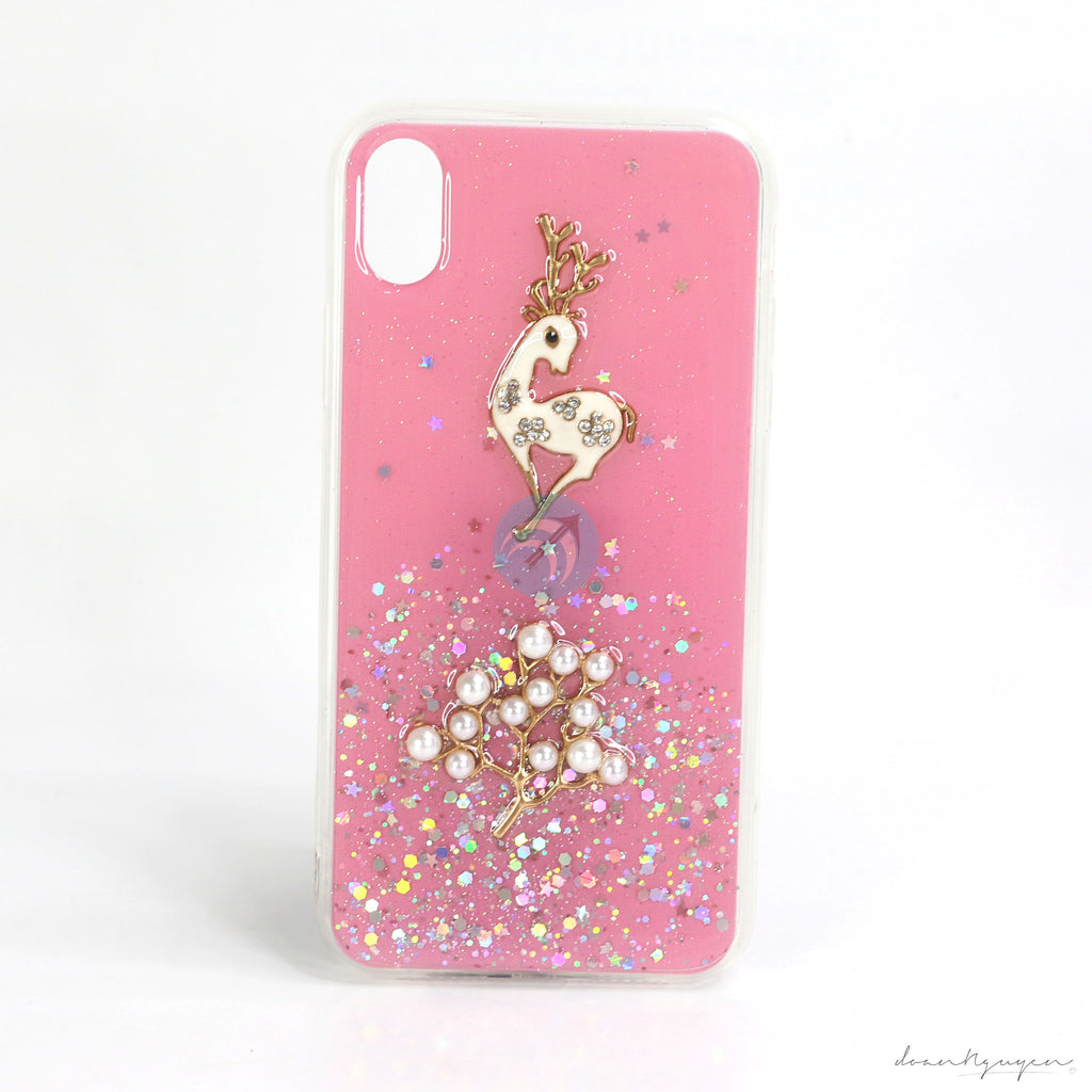 Lưng ốp có hình hươu nổi tinh tế, đính ngọc trai và đá, bên trong có kim tuyến để tăng thêm độ lấp lánh